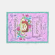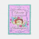 En skylt från vintagens konditorivaror med en chokladkaka och blommor. I färg av rosa och lila och teal.