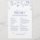 Vi presenterar vår fantastiska Fransk Blue & White Möhippa Game! Det här spelet "vad som finns på din mobil" är perfektens tillägg till din kommande möhippa. Den har en uppfriskande blandning av traditionellt och modernt stil, med klassiska hand plockade blå Victorianska blommigtar av trädgårdsblommor, bin och fjärilar på ena sidan. Dessutom kan du anpassa den med din egen möhippa i modern, handskriven kalligrafi så att den blir verkligt unik. Och som ett speciellt tillsatsdrag vänder du på det för att hitta ett samordnande blått struktur på baksidan och ytterligare detaljer. Tveka inte - det här envisa spelet kommer att göra din fest som alla kommer att minnas! Visa sviten här: https://www.zazzle.com/collections/french_blue_white_victorian_floral_bridal_shower-119265327422133417 Kontakta designern för matchande produkter. Copyright Surridge Design Co. för Elegant Inbjudan, alla höger reserverade.