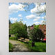 En liten bänk i en underbar grönt på sommaren, ett underbart ställe för vila. Den röda taken i de små husen i bakgrunden bidrar till att skapa stabilitet i denna scen.