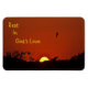 Den här magnet har en lugnande bild av en gull som flyger vid solnedgången med det lugnande budskapet att vila i Guds kärlek.
