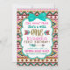 Tribal först födelsedagsfest inbjudan med stampilar och mörk teal blue bow på en söt sydvästra Native American Aztec indisk designbakgrund. Du kan enkelt anpassa den här berömvärda och söta förstaårsinbjudan till stammen genom att helt enkelt lägga till din evenemangsinformation. Det här är en tryckt design utan riktiga bogar, glitter etc.