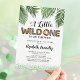 Vild en inbjudan till babydusch med en enkel vit bakgrund, grönt glitter, den tropiska djungeln handflatan lämnar, ordspråket "lite vild ett är på väg" i olika djurtryck och en party-mall som är lätt att anpassa.