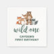 Vild 1! Vattenfärgat Woodland Animal Birthday med björn, räv, hjort, mårkoon och träd.
