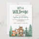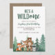 Vild 1! Woodland Animal Birthday med björn, räv, hjort, tvättbjörn och träd med baksida av skogskorn.