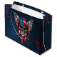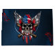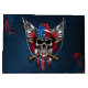 Vild, amerikansk skalle med baseball fladdermus. Skallen exuderar ett grymt uttryck, understruket av framstående tänder och jet-svarta öga socklar. Bakom skallen symboliserar två basebollhandtag fladdermus med skarpa brunhandtag kor varandra, styrka och beslutsamhet. Kombinationen av skallen, baseball fladdermus och flagga skapar en slående visuell beskrivning av frihet, uppror och amerikanskt pride.