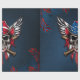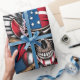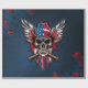 Vild, amerikansk skalle med baseball fladdermus. Skallen exuderar ett grymt uttryck, understruket av framstående tänder och jet-svarta öga socklar. Bakom skallen symboliserar två basebollhandtag fladdermus med skarpa brunhandtag kor varandra, styrka och beslutsamhet. Kombinationen av skallen, baseball fladdermus och flagga skapar en slående visuell beskrivning av frihet, uppror och amerikanskt pride.