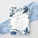 Vår Vild Azure inbjudningskort för möhippan har information om din möhippa i chic svart, inramad av målad vattenfärgsblad i isiger av marin och himlar blå. En ny utveckling av den botaniska trenden med vintry löv och elegant calligraphy accents.