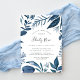 Vår elegant Vild Azure inbjudningskort för möhippan har din möhippa i off-black block och calligraphy-skriptbokstäver, framtagna med målad vattenfärgsblad i isigens vinternyanser av blått.