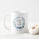Mugg är en söt och elegant gåva till budens mamma, och har en blå och vit vattenfärgad botanisk krans med "budens mamma" inskriven i handskrivet skript. Anpassa med din bröllop-dejt under.