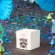 Vild ett berg-in-inspirerat skodonduschtema för babybabybabydusch med baby-rackoon med rosa mohawk och hjärta över en öga.