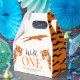 För den lilla som firar sin första födelsedag. "Vild ett"-safari-djur tiger upp födelsedagstorgen. Enkel personlig med att ta med din lille namn och händelseinformation. Den text du väljer visas längst fram och längst bak i rutan. För den lilla vilden som kärlek tigrar.