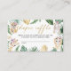 Jungle & safari temat guld och grönt babyduschkort med raffelkort för vild djurdesign och tropiska löv mönster på baksidan.