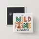 Vild En djungel tog första födelsedagsknappen. Design har typografiskt skript Vild ett i trendiget med bokstäver i safari färger och brev ''o' i en tiger. Anpassa med en namn. Perfekt för första födelsedagsfirandet.