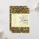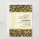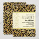 En födelsedagsinbjudan med ett stilrent mönster med exotiska leopardfläckar i svart på en guldbakgrund. En krämfärgad rektangelram med en falsk guldfoliekantrand lagd över med din festtext inuti. Guld falskt konfetti längs den vänstra kanten.