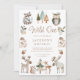 Tema 1:a födelsedagsinbjudan för vita trädsdjur (vild ett), med baby-skogsdjur, svampar, akorner och träd som omger inbjudan.