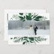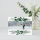 Det moderna botaniska bröllop-tack som du har med vykort har en överkant och grund gräns av lush-vattenfärgsblad i rik-skuggor av jägare grönt, vilket ger ditt favoritfoto från bröllop. Anpassa med namn och bröllop och lägg till "kärlek och tack" i svartsvarta bokstäver. Lägg till ditt personliga förtryckta meddelande på baksidan med ett ytterligare foto. Innehåller även returadressen med gott om utrymme för mottagaradressering. Om du vill lägga till ett handskrivet meddelande tar du bara bort den exempeltext som visas. Designad för att samordna med vår Vild Forest-inbjudan och pappersinsamling.