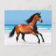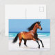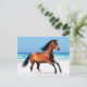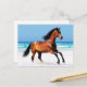 Vykort i porträtt på en vacker vild-häst på en strand, med vit surfa och blå himmel