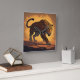 En dramatisk digital illustration av en vild leopard som strövar över sprucken jord vid solnedgång, fångar kraft, smygande och intensitet. Varm bakgrundsbelysning, djärva fläckar och dynamisk pose förmedlar vild energi och fara.