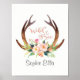 Den här teckningen ser både rustik och elegant ut. Hjort och rosa blombuquet är i vattenfärg. Anpassa med ditt barns namn.