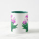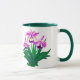 Kaffe mugg i en digital illustration av en vild- eller chidväxt, baserad på botaniska vintagar, med blommor i lavendelfärgade lavender till djup ametyst-lila och mörk grönt löv