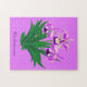 Pussel i en digital illustration av en vild- eller chidväxt, baserad på botaniska vintagar, med blommor i lavender-nyans till djup ametyst-lila och mörk grönt löv