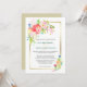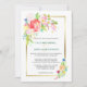 En söt vår-blommigt bouquet i färg av korall rosa, lavendel rosa, vit, blek gult, guld och blå nestel mellan grönt och löv vid den övre lämnat hörnet av denna bröllopsinbjudan. Vid grund-högerna finns en mindre bild av blommigten som samordnar sig. Bakom två bilder finns en glansig guld ram som omger anpassningsbarna. Texten står i grått och teal grönt i mitten. Blommigtens vattenfärgsbild och text placeras på en vit elegant bröllop-bakgrund. Baksidan av inbjudan är det solida antika guld. Snygg för vår, sommar och höst bröllop! Se till att se motsvarande bröllop-produkter i vår butik.