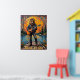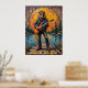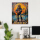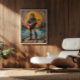 Denna dynamiska målning fångar ett kraftfullt lejon, prytt med solglasögon och läderjacka, som släpper lös en "vild röst" genom sin elgitarr. Det står på en rustik träpir och blickar ut över en lugn blå sjö med avlägsna tallskogar under en ljus himmel. Konstnärens användning av djärva, texturrika penseldrag ger scenen en rå energi som perfekt förmedlar "Rock or Die" -attityden.
