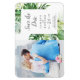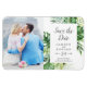Den här vilden tropiska handflatan-fotot spara datum magneter är perfekt för ett strand- eller destinationsbröllop. Utformningen har en exotisk uppsättning grönt vattenfärgsbanans löv handflatan träd, ferns, löv, botaniska växter och grönt för en tropisk sommarkänsla. Anpassa med förlovningens foto, namn, bröllop-datum och webbplats adress.