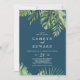Den här vilden är en inbjudan till ett bröllop med den tropiska marinen handflatan om blått avslappnad är perfekt för en strand eller ett destinationsbröllop. Utformningen har en exotisk uppsättning vattenfärgade bananträd i handflatan träd löv, ferns, löv, botaniska växter och grönt på en marin blå bakgrund för en tropisk sommarkänsla.