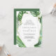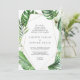 Det här vild tropiska handflatan-geometriska vigselkortet är perfekt för en strand- eller destinationsbröllop. Utformningen har en exotisk uppsättning grönt vattenfärgsbanans löv handflatan träd, ferns, löv, botaniska växter och grönt för en tropisk sommarkänsla.