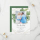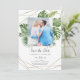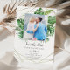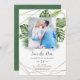 Den här vildens tropiska handflatan-geometriska foto sparar datumkortet som perfekt för en strand eller ett destinationsbröllop. Utformningen har en exotisk uppsättning grönt vattenfärgsbanans löv handflatan träd, ferns, löv, botaniska växter och grönt för en tropisk sommarkänsla. Anpassa med förlovningens foto, namn, bröllop-datum och webbplats adress.