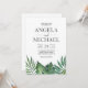 Denna vilda tropiska palm hexagon lediga bröllopsinbjudan är perfekt för ett strand- eller destinationbröllop. Designen har en exotisk samling av gröna akvarell bananpalmblad, ormbunkar, lövverk, botaniska växter och grönska för en tropisk sommar känsla.