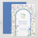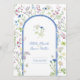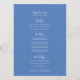 Vacker botanisk skissad vattenfärgbröllopsmeny i vitt med vacker sammanflätad persilja hartwort-blomma och blåklint-monogram och ett urval av vilda blommor skisser runt en blåklintblå valv på framsidan, blå på baksidan med ditt eget val av fyrakursmeny i vit text. Blommorna är alla handmålade vattenfärger. Diskret blomsterinbjudan med skrivstilstext på vit med nyanser av grönt, blått, lila, mauve och mjuk persika och gula. Anpassa med dina egna initialer, namn och meny detaljer. Andra matchande föremål finns tillgängliga eller kan skapas på begäran. Original handvattenfärgade vilda blommor målningar och design av Sarah Trett för www.mylittleedenweddings.com