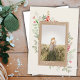 Vild blomsterdesign runt kartong inspirerad rektangel med vit text och ditt anpassade foto. Off-vit bakgrund.