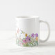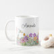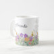 Denna keramiska kaffekopp har en vacker design med vilda blommor i rosa och lila blommor och grönska. Personalisera denna kopp med ditt namn eller annan text. Denna kaffekopp skulle vara en genomtänkt husvärmnings- eller födelsedagspresent.
