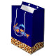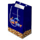 En presentpåse designad med en exotisk orange färgad leopard i gräns längs grund. Illustrerad med en digital vattenfärgsbild av en flock av vilda djur som går samman. Djuren är bland annat en hoppande delfin, en giraff, elefant, kangaroo, rhino, lejon och leopard. Bakgrunden är en blåaktig lila färg.