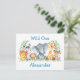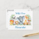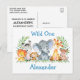 Akvarell Safari Djungeldjur Vild Ett Första Födelsedagsfest Inbjudan Postkort. Bebisdjur inkluderar Elefant, Apa, Giraff, Noshörning, Zebra och Lejon på ormbunksblad. Akvarell Botanisk Grönska. Blå Text.