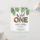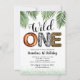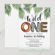 Safari inbjudningskort för 1-årsfest med enkel vit bakgrund, grön glitter, tropiska djungelpalmer, uttrycket "vild en" i olika djurmönster, och en festmall som är lätt att anpassa.