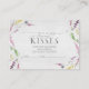 Modern, elegant bröllopsspel "gissa hur många kyssar" med vattenfärgade vilda blommor-motiver i mjuka nyanser av rosafärgat, lila och lavendel, gula, blå och ömtåliga gröna botaniska blad. Anpassa dina bröllopsdetaljer i mjukt svart, accentuerat med vacker modern handskriven kalligrafi. Del av en koordinerad kollektion. Se hela kollektionen här: https://www.zazzle.com/collections/elegant_wildflower_watercolor_floral_bridal_shower-119635760261893795 kontakta designern för ytterligare produkter. Copyright Elegant Invites, alla rättigheter förbehållna.