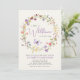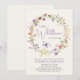 En elegant ljuscrème baby shower-inbjudan med "en liten vildblomma är på väg" skriven i en mix av mjuk grå typografi och ett stilrent lila-lavendel-skrift, och boho-inspirerade akvareller av en krans av lila, rosa, persika och gula vildblommor och en lila fjäril. Personifiera mammans namn och showerdetaljer i enkel lila och grå typografi.