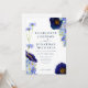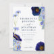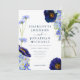 Vackra rustika boho handmålade akvarell sommarvilda blommor i marinblå, blåklintblå, lila, gröna och gula nyanser bröllopsinbjudan med online-rsvp bröllopswebbplats och QR-kod på baksidan. Blommor inklusive cosmos, blåklint, vallmo och förgätmigej med lövverk. Lättanvänd mall med modern elegant typsnittsstil. Perfekt för ett unikt floralt botaniskt marinblått tema för en sommar- eller vårbröllop. Unik originalkonst av konstnären Catherine Sweetman