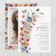 Boho-examensfest med vilda blommor Inbjudan. Tillkännage din fest med denna slående inbjudan med en graciös sidobukett av handmålade boho-vilda blommor i mörkblått, ljust rosa, skärrosa, gyllengult, levande rött och salvia grönt, kompletterat med ett fullstort examensfoto på baksidan. De livfulla färgerna fångar essensen av vår och sommar medan du anpassar meddelandet, färgerna och bakgrunden för att skapa en inbjudan som verkligen talar från hjärtat - låt din vision blomstra!