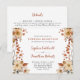 Höstblommor Kvällsboende Bröllopsinbjudan... Vår unika "fram- och baksida" postkortsstora inbjudan till kvällsreceptionen har en hösttematisk blomsterdesign i nyanser av terrakotta, ros, kräm och salvia som gränsar till din mottagningsinformationstext på en krispig vit bakgrund. Terrakottaskrift i kombination med svart serif och uttrycksfull kursiv text skapar en enkel rustik look, idealisk för ett sensommar- eller höstbröllop. Baksidan av inbjudan innehåller din bröllopswebbplats QR-kod samt webbadressen skriven i text så att dina gäster kan svara enkelt online och även se de detaljer de behöver veta, inklusive måltidsalternativ, tillgängliga boenden och gåvor registrerade webbplatser. All exempeltext kan enkelt ersättas med din egen information i personal
