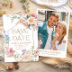 Fira din kärlek med en livfull och elegant "save the date"-inbjudan med färgglada vilda blommor, speciellt utformad för vår- och sommarträdgårdsfester och bröllop. Denna vackert illustrerade inbjudan har mjuka pastellfärgade blommor och löviga botaniska element, inspirerade av blommande vildblommefält och romantiska utomhusfiranden. Den känsliga blomsterpaletten skapar en fräsch, glädjefylld och tidlös look som är perfekt för par som planerar ett naturinspirerat, bohemiskt, rustikt eller trädgårdstemat bröllop.
