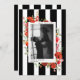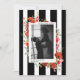 Botaniskt bröllopsmonogram med grönska och vildblommor inklusive vallmo och tusenskönor med svart-vit randig bakgrund. Anpassa med ditt foto och text.