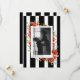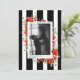 Botaniskt bröllopsmonogram med grönska och vildblommor inklusive vallmo och tusenskönor med svart-vit randig bakgrund. Anpassa med din foto och text.