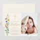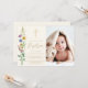 Denna blomster dop foto inbjudan har vildblommor och ett kors med stilfull guldbokstavs typografi på en mjuk krämfärgad bakgrund. Lätt att anpassa med dina detaljer och foto. Original Watercolor © Michele Davies.