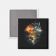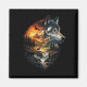 En hisnande dramatisk dubbelexponeringsillustration som smälter samman en majestätisk gråvargsporträtt med ett svepande vildmarkslandskap av brinnande berg, tallskogar, en kaskadvattenfall, månuppgång och silhuetter av vilda djur inklusive en hjort, björn och en flygande örn.