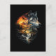 En hisnande dramatisk dubbelexponeringsillustration som smälter samman en majestätisk grå vargporträtt med ett svepande vildmarkslandskap av brinnande berg, tallskogar, en kaskadvattenfall, månuppgång och silhuetter av vilda djur inklusive en hjort, björn och en flygande örn.