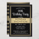 Inbjudan familj och vänner till en elegant firande för honom eller henne med snyggt svart, vit och guld födelsedagsfest inbjudan. Bilder och alla formuleringar i den här mallen är enkla att anpassa. Designen har faux foil gräns och ribbonöverlägg, klassisk skriptkalligrafi och vintage art deco-inspirerad typografi. Observera att guld är tryckt på färg, inte metallfolie. Den här kortmallen är lätt att anpassa för alla år eller händelsetyper och passar antingen en man eller en kvinna. Grattis på födelsedagen!